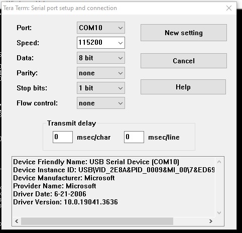 Connecting to the RomWBW bus is as easy as plugging in a micro USB cable, and setting your computers terminal software to 115200, 8 bits, 1 stop bit, no parity to the CDC/pico serial port this is automatically detected.